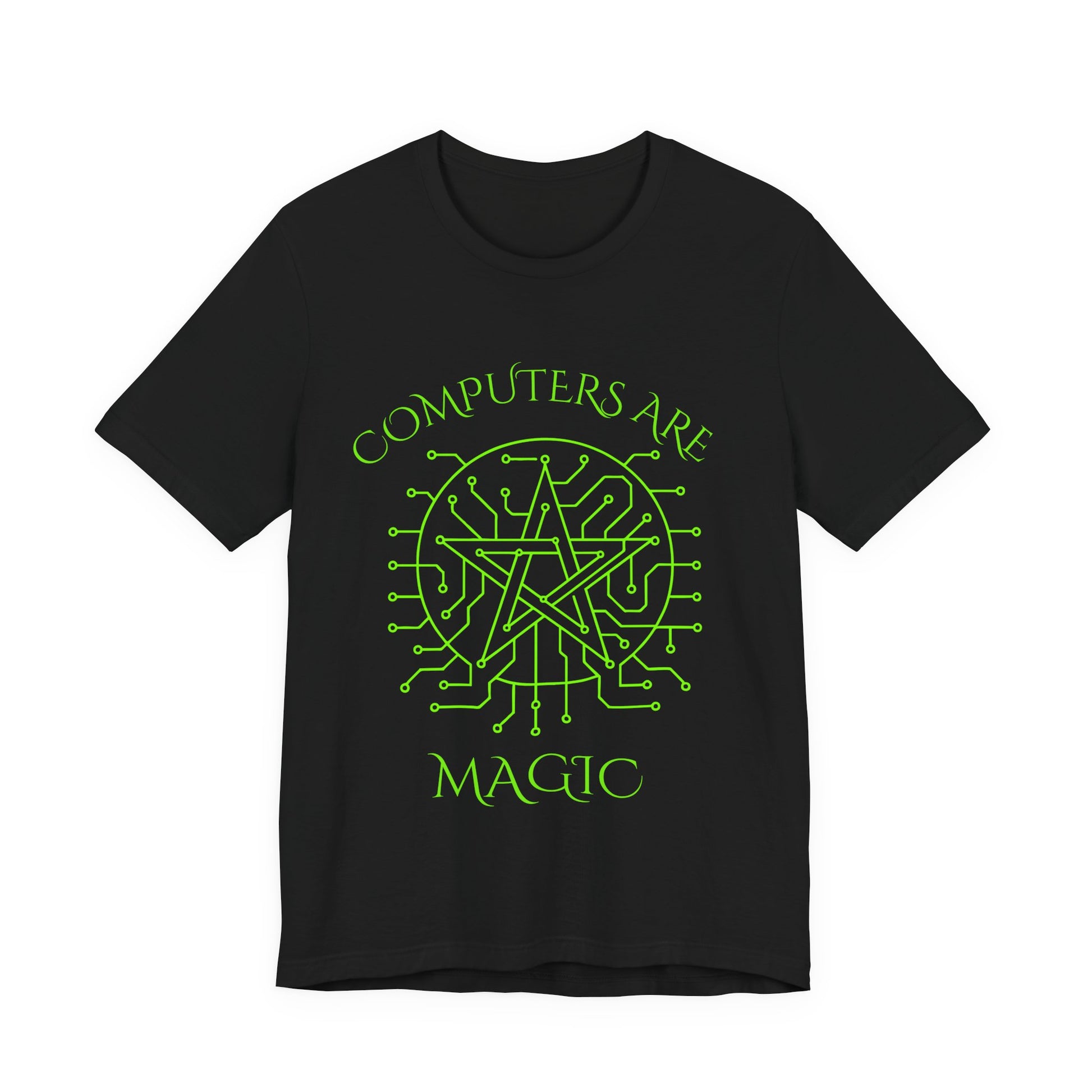 Show off your love for both technology and the mystical with this bold “Computers Are Magic” T-Shirt. Featuring a neon-green pentagram circuit design and gothic lettering, this shirt blends witchcraft aesthetics with computer geek humor. Perfect for gamers, programmers, witches, and anyone who knows there’s real magic in the code.