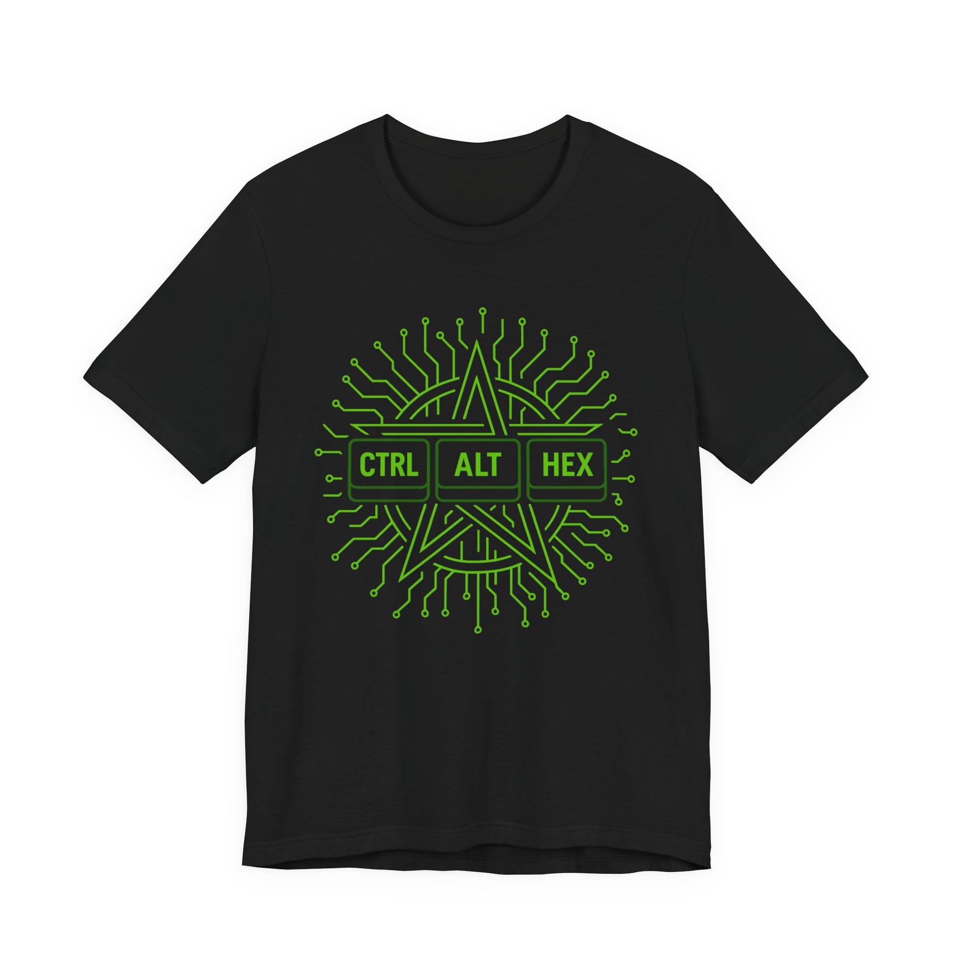 Cast a spell on your wardrobe with this clever “Ctrl Alt Hex” T-Shirt. Blending witchcraft vibes with computer geek humor, the design features a glowing green pentagram surrounded by circuitry and bold keyboard key graphics. Perfect for programmers, gamers, witches, and anyone who loves a mix of magic and technology.