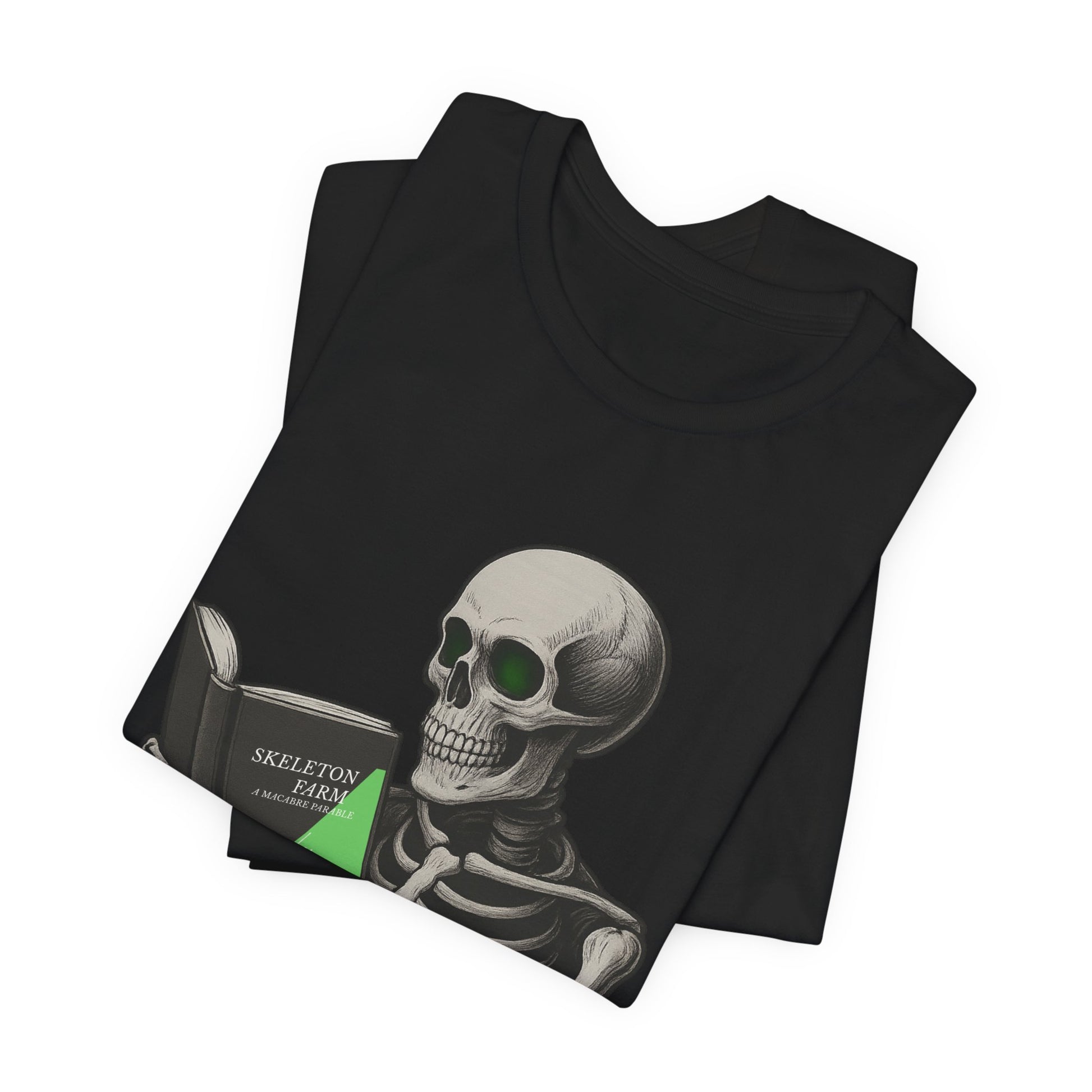 A darkly funny undead twist on the classic Animal Farm. This design features a detailed skeleton holding a parody first-edition style book cover titled “Skeleton Farm”, reimagined with a Gallowmancy spin — bold lines, gothic flair, and deliciously morbid humor.