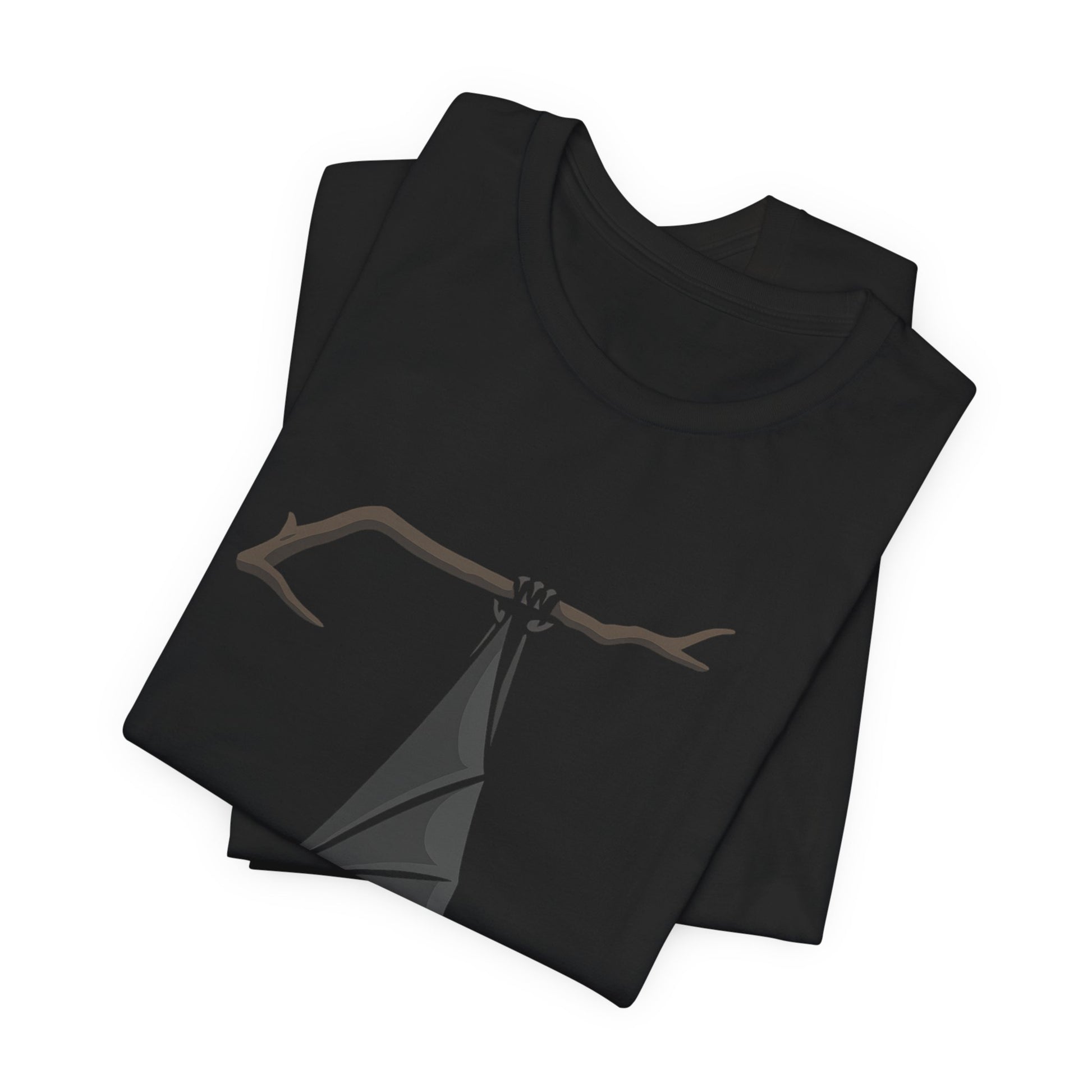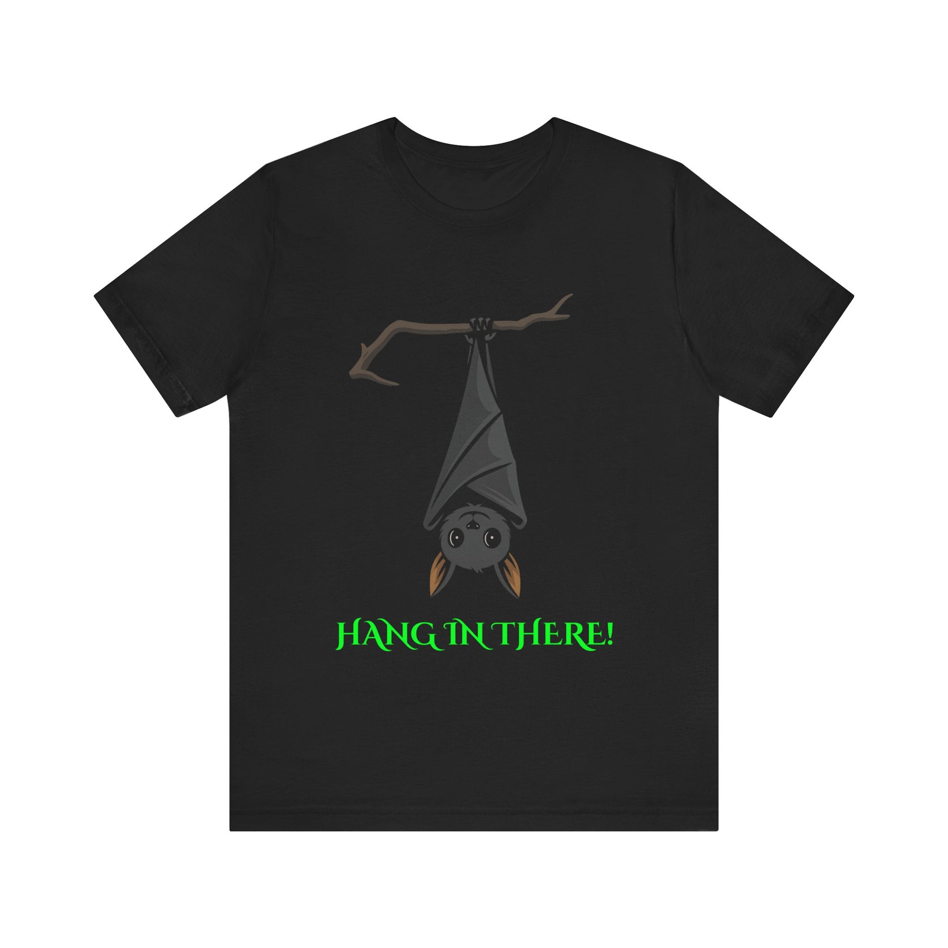 Show off your sense of humor with this creepy-cute “Hang In There” bat t-shirt! This design features a stylized fruit bat hanging upside down from a branch, paired with the playful phrase “Hang In There” in bold green gothic lettering.