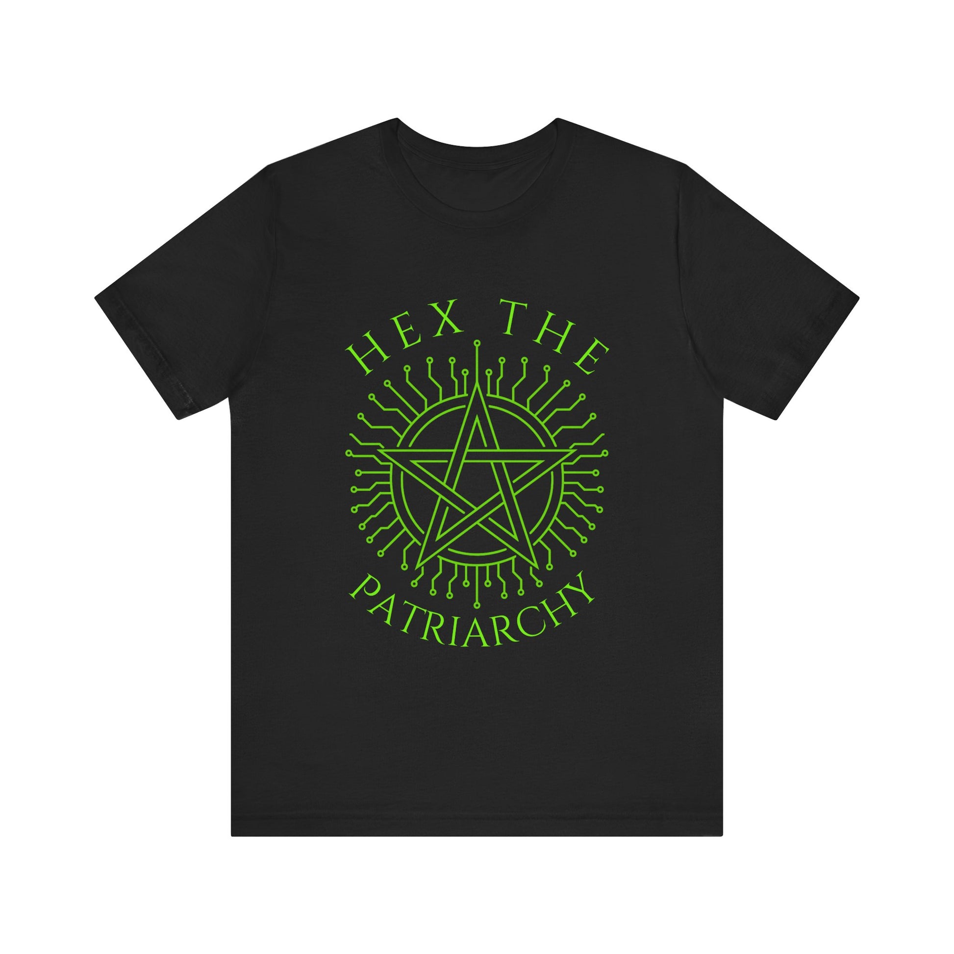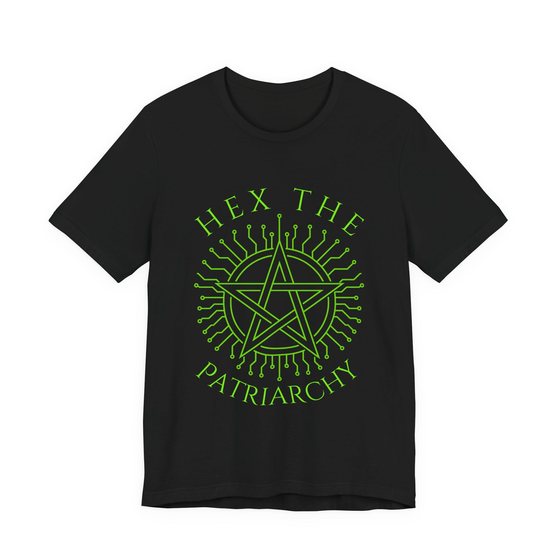 Make a bold statement with this powerful “Hex the Patriarchy” T-Shirt. Featuring a glowing green pentagram surrounded by circuit-like lines, this design fuses witchcraft aesthetics with modern rebellion. Perfect for witches, feminists, pagans, and anyone who believes in smashing the patriarchy with a little extra magic.