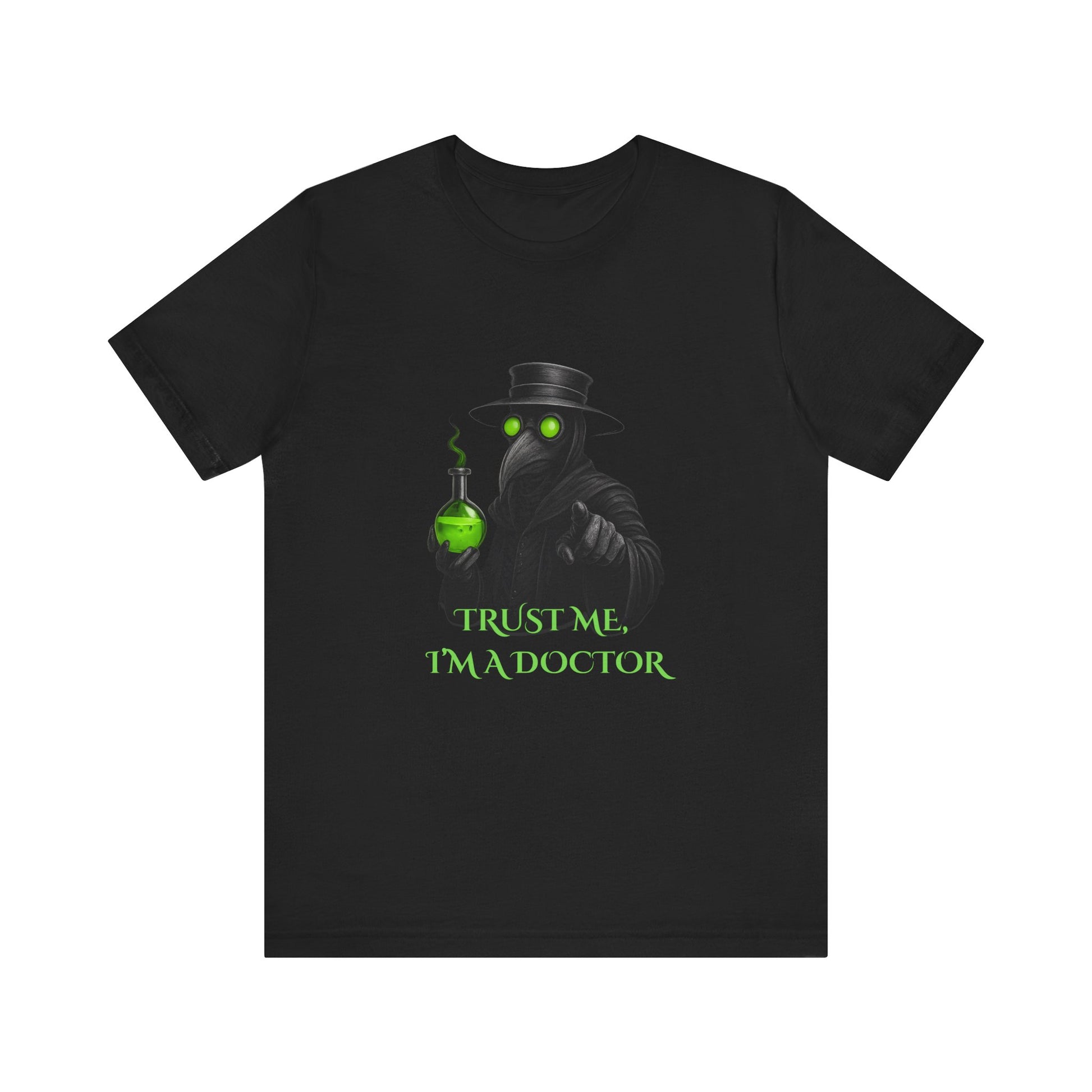 Step into the shadows with this bold plague doctor graphic tee. Featuring a chilling design of a plague doctor with glowing green eyes and a bubbling flask, this shirt captures gothic, dark fantasy, and horror vibes with a playful twist. The text "Trust Me, I’m a Doctor" makes it the perfect blend of creepy and humorous.